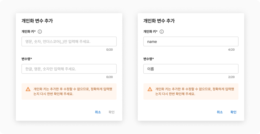 개인화 키는 추가 후 수정할 수 없어, 정확한 값인지 반드시 확인해 주세요.