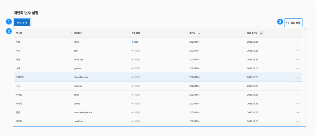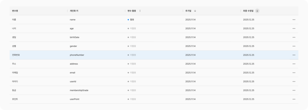 - 개인화 변수 설정에서 추가한 변수는 현재 브랜드 메시지에서만 활용 가능합니다. 그 외 캠페인은 추후 업데이트를 통해 순차적으로 적용될 예정입니다.